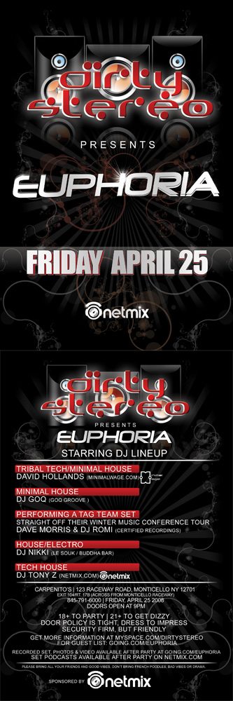Dirty Stereo presents Euphoria (April 25, 2008) dirtystereo_combined Flyer for Dirty Stereo presents Euphoria, which takes place April 25, 2008 in Monticello, NY Liked it? Take a second to support Netmix.com on Patreon!